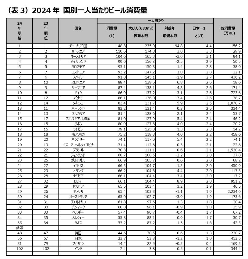 なお1人当たり消費量でもドイツは8位→10位に後退、日本は56位でした。「2024年 世界主要国のビール消費量」キリンホールディングス拡大画像表示