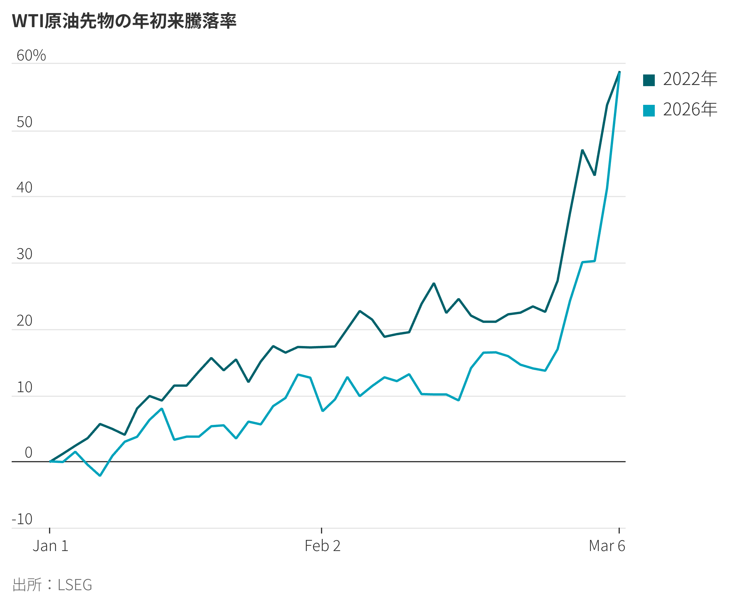 投資家は先週、イスラエルと米国によるイラン攻撃について、またしても無視できる程度の短期戦になると当初は確信していた。2日の米株式市場ではS&P500種指数が小幅に上昇さえした。ところが週後半になると、中東全域に紛争が拡大したことに伴う世界的な原油高は、2022年にロシアがウクライナに侵攻した際といくつかの点で似通っており、スタグフレーション(景気停滞とインフレの同時進行)を招く恐れがあるのではないか、と懸念するようになっていた。投資家が今直面している問題は、懸念の兆候が見られることを、押し目買いの理由にすべきか、それとも事態がさらに悪化する前に撤退する理由にすべきかだ。まず、ロシアによるウクライナ侵攻時との比較から始めよう。当時の原油価格は、投資家が供給混乱を織り込む中で、侵攻前の1バレル=90ドルから同120ドルまで急騰した。現在はまだ91ドルにとどまっている(訳注:米原油価格は8日、100ドルを突破した)。ただ、上昇率は22年と同じであり、価格水準が低いだけだ。原油市場は激しく揺らいでいる。