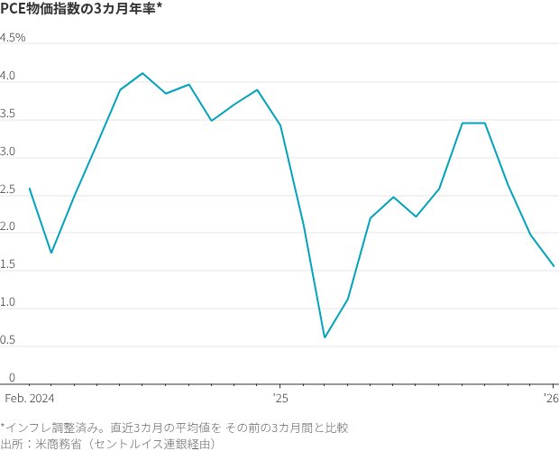 米商務省が13日発表した昨年10-12月期の実質GDP(国内総生産)伸び率改定値は、年率換算で0.7%と、速報値1.4%から下方修正された。いずれの数字も、昨年秋の連邦政府機関の一部閉鎖で押し下げられていた影響で、今四半期はその反動が見込まれている。とはいえ、経済活動の最大の構成要素である個人消費は鈍化している。13日に公表された別の統計によれば、今年1月までの3カ月間の個人消費は、年率換算で前の3カ月に比べ1.6%の伸びにとどまった。