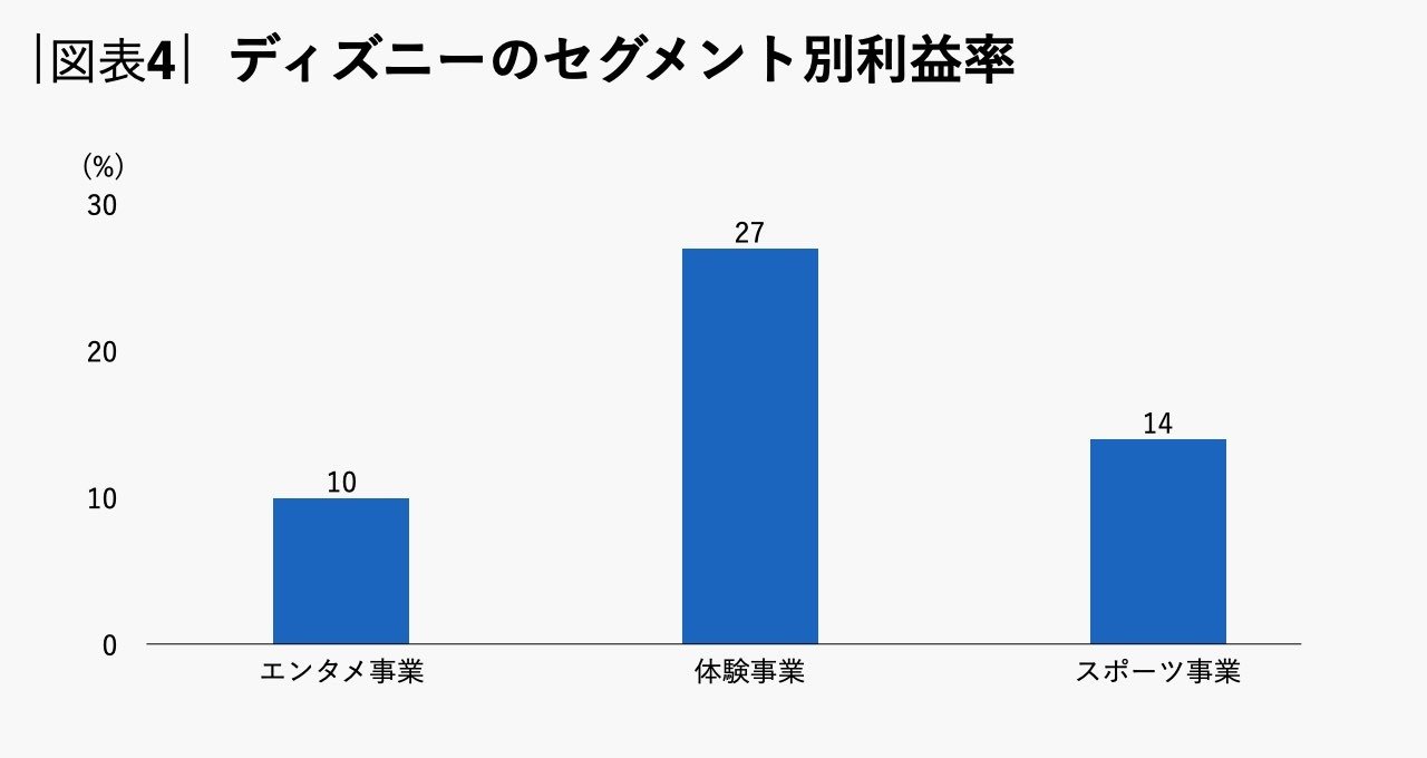 このように、ディズニーの事業の中で利益率が最も高いのは体験事業であり、売上高の44%を占めるエンタメ事業の利益率は10%と、3つのセグメントの中で最も低い水準に留まっています。