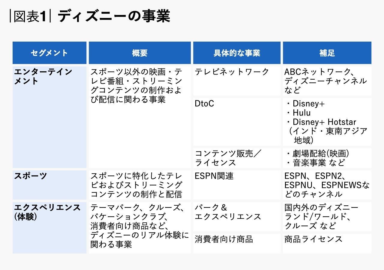 ウォルト・ディズニー・カンパニー(以下、ディズニー)とネットフリックスの戦略を比較した時の最大の違いは、「事業領域」です。ネットフリックスは動画ストリーミング事業一本のみですが、ディズニーは図表1に示すように、その事業は多岐にわたっています。