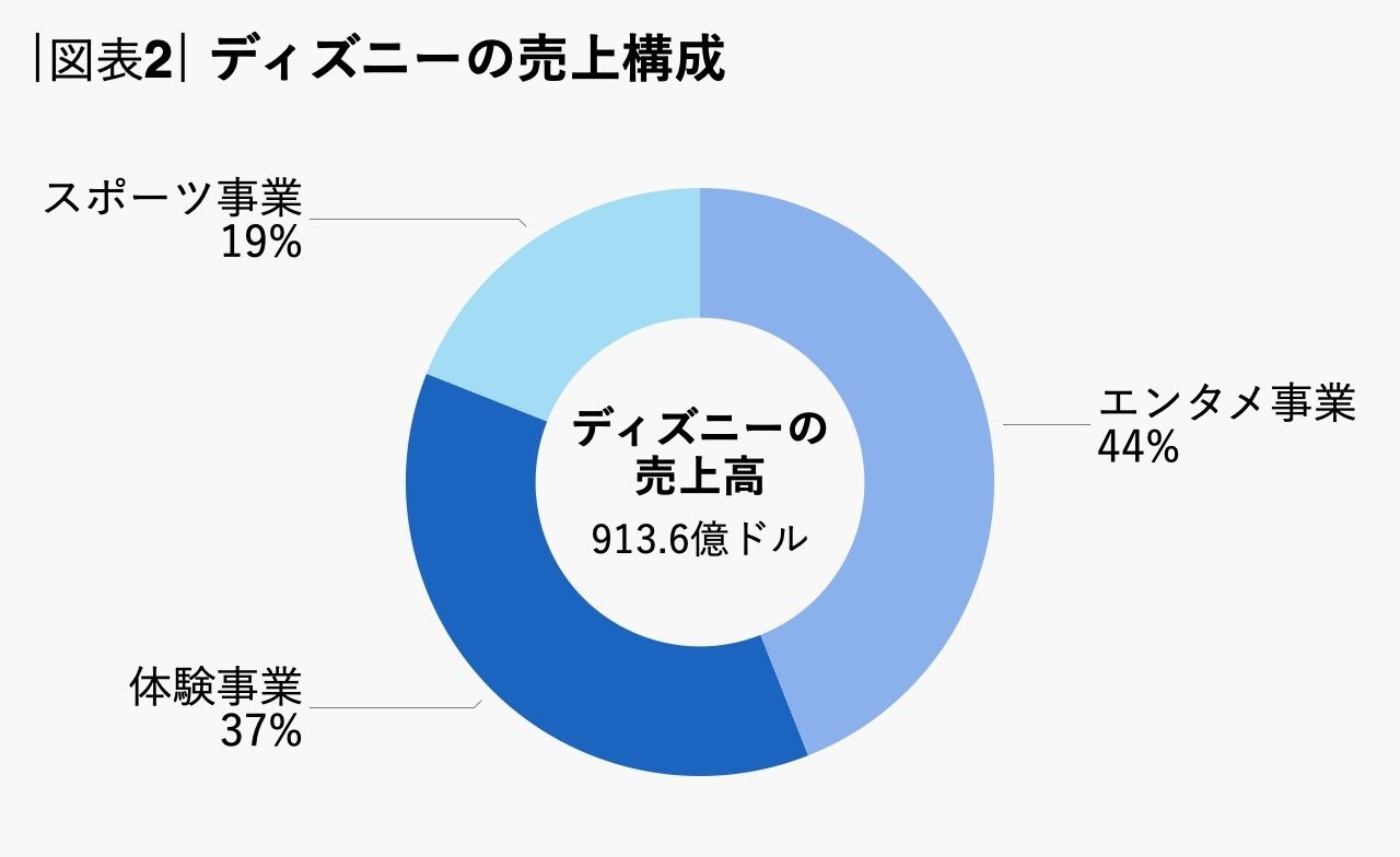 図表2からもおわかりの通り、ディズニーの売上高で最も大きな割合を占めているのはエンタメ事業(44%)であり、それに体験事業(37%)、スポーツ事業(19%)が続きます。
