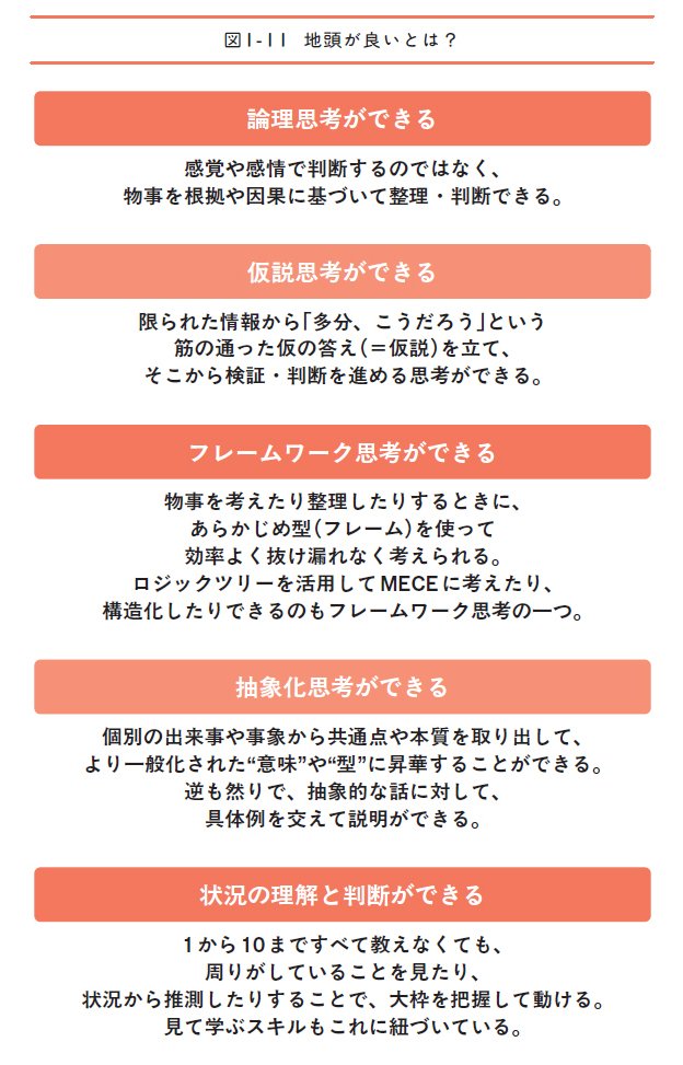 こうした前提を踏まえて、私なりに「地頭の良い人」を定義するなら、それは知識量ではなく、「自分の頭で考えて正解にたどり着ける人」のことです。アーティスティックな独創性や創造力などは含まず、論理的に理解・判断・構築できる思考力を指します(図1-11)。