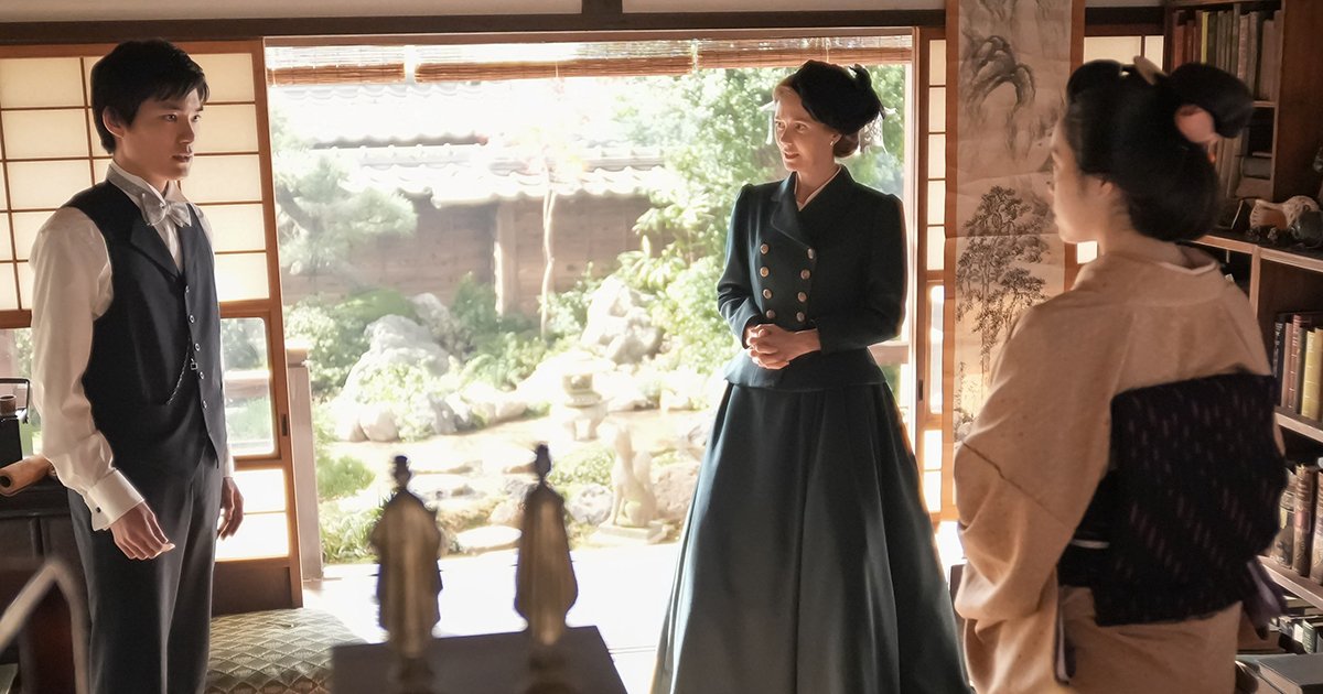 ヘブン(トミー・バストウ)の訃報(ふほう)を聞いて日本にやって来たイライザ(シャーロット・ケイト・フォックス)。よくよく見ると、イライザも特殊メイクで老けて見える。