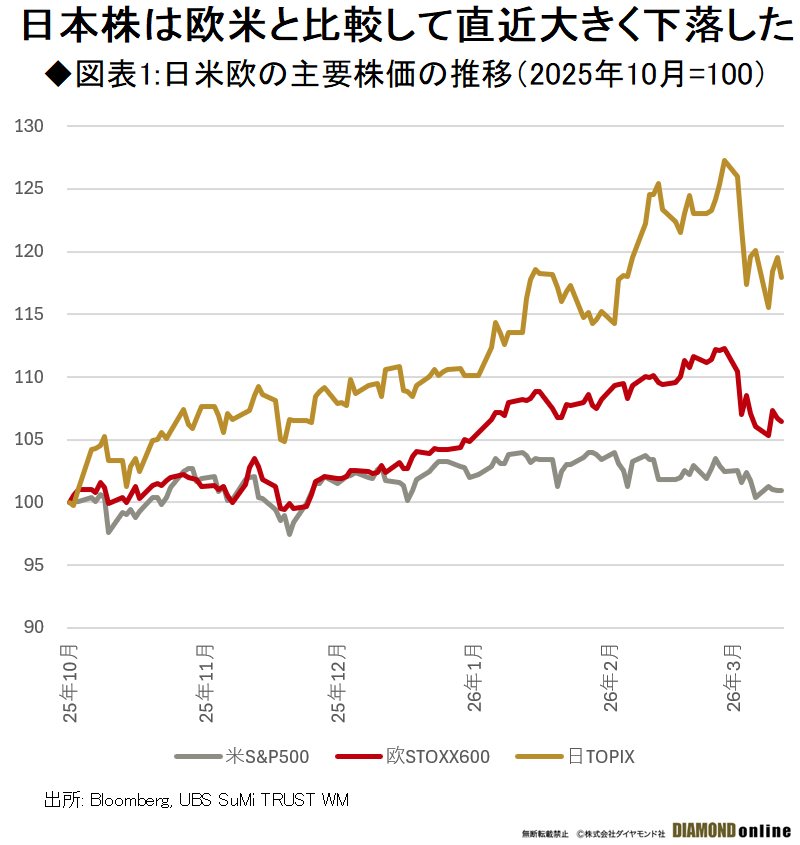 高市政権下の構造改革期待を追い風に上昇してきた日本株は、中東情勢の緊迫化と原油高を受けて急反落した。日本がエネルギー輸入国であることに加え、選挙後に積み上がった海外投資家の買いポジションが短期間で巻き戻されたことも下押し要因だ。ただ、情勢が沈静化すれば物色の軸は再び業績と政策恩恵に戻る可能性がある。(UBS SuMi TRUSTウェルス・マネジメント ジャパン・エクイティ ストラテジスト 小林千紗)