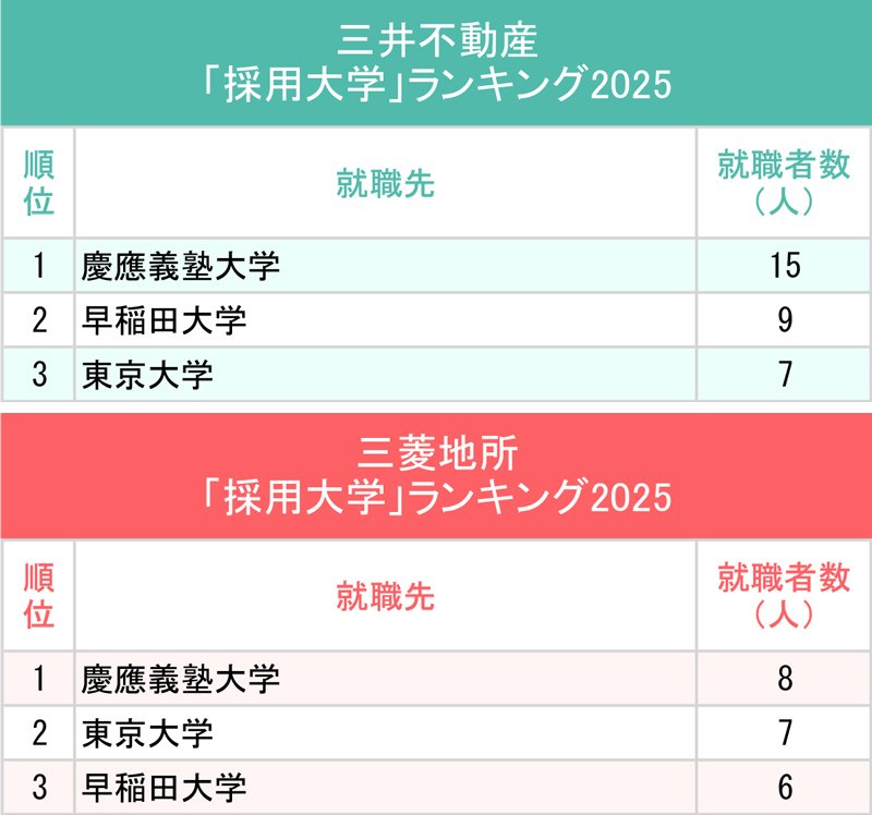 2024年の不動産2社の採用大学ランキングでは、三井不動産の1位は早稲田大と慶應義塾大が並び、三菱地所の1位は慶應義塾大だった。