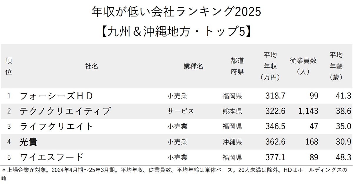 今回は、上場企業の有価証券報告書に記載された平均年収のデータを使い、「年収が低い会社ランキング【九州・沖縄地方】」を作成した。