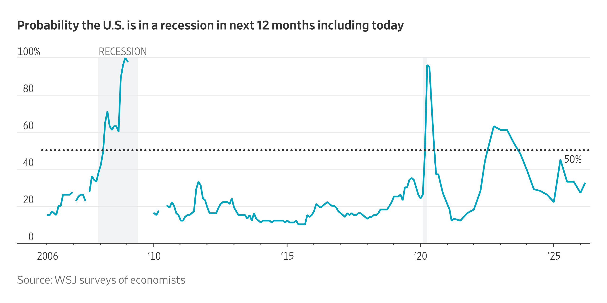 表:米国が1年後にリセッションに陥る確率(WSJエコノミスト調査の回答平均)イランとの戦争で石油供給は「史上最大の混乱」に陥り、原油や他の商品価格が急騰している。それでもエコノミストらは、米国がリセッション(景気後退)に陥るリスクは高くないとみている。ウォール・ストリート・ジャーナル(WSJ)が今週実施したエコノミスト調査のコンセンサス予想では、石油ショックが一時的なものであれば、インフレは一時的に高まるものの、成長率や失業率はほぼ変わらないとの見方が示された。エコノミック・アウトルック・グループのバーナード・バウモール氏は「中東での戦争継続、原油価格の急騰、高関税、人工知能(AI)、移民に対する厳しい制約などを考えると、米国経済がこれほどまでに底堅さを維持していることは注目に値する」と述べた。「しかし、この底堅さを当然視すべきではない」