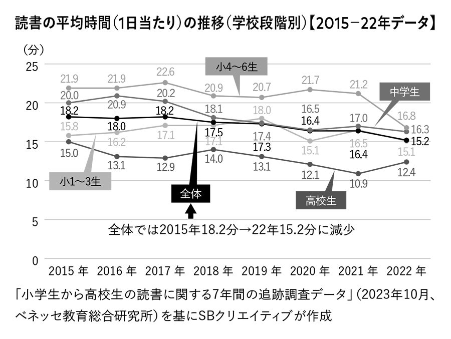 また、子ども全体の1日あたりの平均読書時間を見ると、2015年の18.2分から2022年には15.2分と、7年間で約3分減少しています。
