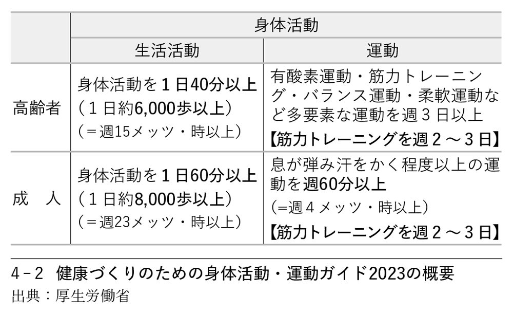 2024年1月に、厚生労働省は「健康づくりのための身体活動・運動ガイド2023」を策定し、運動の効果を得るための基準を示しました(表4-2)。それまで利用されてきた「健康づくりのための身体活動基準2013」を10年ぶりに改訂したもので、最新の科学的根拠をもとに作られました。