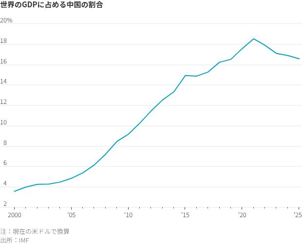 ところが実際には、中国経済の世界経済に占めるシェアは低下し、2025年末時点では約16.5%となった。国際通貨基金(IMF)のデータによれば、現在の中国経済の規模は米経済の3分の2に満たない。
