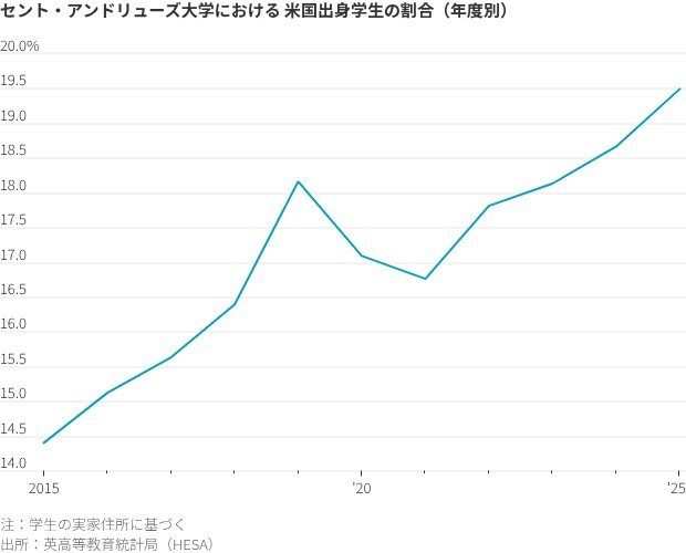 絵のように美しいキャンパスを持つセント・アンドリューズ大学は、かつては米東海岸の富裕層が通う私立高校の生徒たちの「知る人ぞ知る進学先」だった。しかし、今では全学生の約2割が米国人だ。英高等教育統計局(HESA)によると、セント・アンドリューズ大は昨年、2200人を超える米国人学生が在籍し、オックスフォード大学を抜いて「英国で最も米国人学生が多い大学」になった。