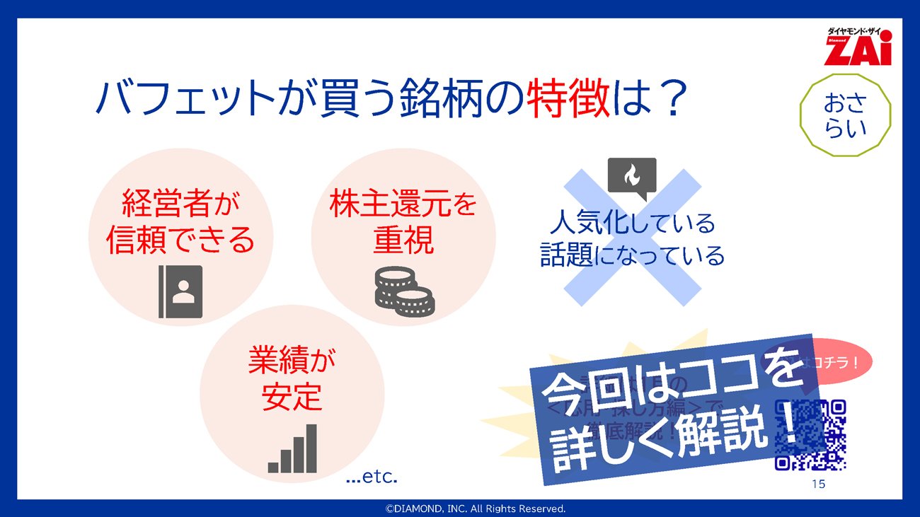 一番売れてる月刊マネー誌『ダイヤモンドZAi』のオンライン講座「バフェット入門」<応用・探し方編>。投資の神様・ウォーレン・バフェットが優良銘柄を見つけ出すためには、独自の明確な基準が存在する。今回は、彼が実践している銘柄選びの基本である「定量的・定性的評価」の考え方と、投資大成功の鍵となる“7つの基準”の1つ目から詳しく解説していく。(ダイヤモンド・ザイ編集部)