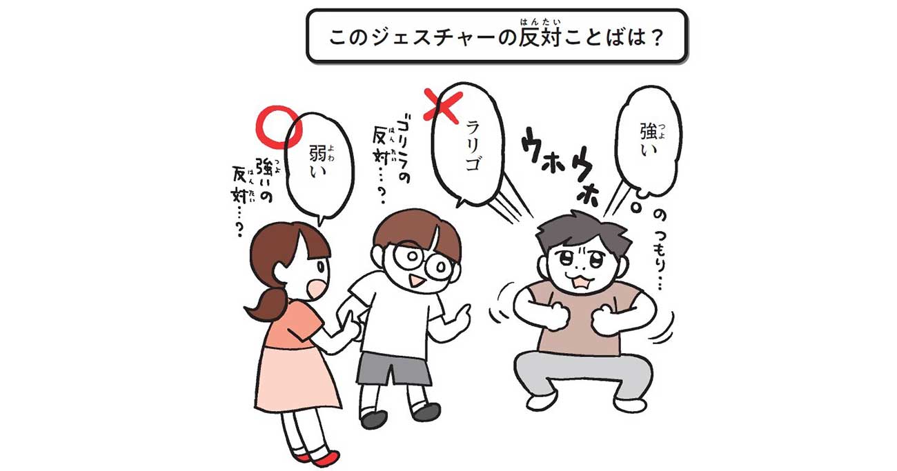 これは、ことばをジェスチャーで表し、その対義語を当てるゲーム。体を使って遊びながら語彙力を伸ばすことができるユニークなゲームです。
