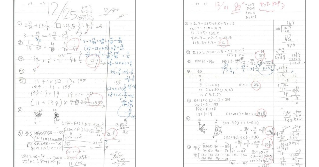 たとえば、冒頭にあげたノートの写真は、どちらもある5年生の女の子の算数の家庭学習用のノートです。