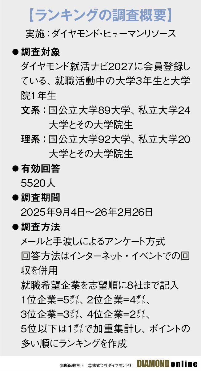 就職人気企業ランキング27年卒【文系男子・ベスト50】1位は伊藤忠商事、3位は三井物産、2位は? 高村太朗: ダイヤモンド・ヒューマンリソース 経営企画室 室長 予測・分析就職人気企業ランキング2027年卒後半戦調査 2026年3月30日 5:30 記事をクリップ URLをコピー 記事を印刷 Xでシェア Facebookでシェア はてなブックマークでシェア LINEでシェア noteでシェア 拡大画像表示 拡大画像表示 Key Visual by Noriyo Shinoda 1 2 3 4 5 [{:code=>"10137896", :name=>"伊藤忠商事"}, {:code=>"10137918", :name=>"丸紅"}, {:code=>"10138035", :name=>"豊田通商"}, {:code=>"10138205", :name=>"三井物産"}, {:code=>"10138426", :name=>"住友商事"}, {:code=>"10138477", :name=>"三菱商事"}, {:code=>"10206472", :name=>"三菱UFJフィナンシャル・グループ"}, {:code=>"10218772", :name=>"三井住友フィナンシャルグループ"}, {:code=>"10067847", :name=>"森ビル"}, {:code=>"10142180", :name=>"大和証券グループ本社"}] この記事に関連する企業 伊藤忠商事 丸紅 豊田通商 三井物産 住友商事 三菱商事 三菱UFJフィナンシャル・グループ 三井住友フィナンシャルグループ 森ビル 大和証券グループ本社 記事をクリップ URLをコピー 記事を印刷 Xでシェア Facebookでシェア はてなブックマークでシェア LINEでシェア noteでシェア おすすめの会員限定記事 関連記事 東大・京大・難関国立大の新卒者を多く採用している企業ランキング【300社】7位マッキンゼー、4位NTT、1位は?大学別内訳も公開 ダイヤモンド編集部,山本 輝 早慶上理の新卒者を多く採用している企業ランキング【300社】9位EYコンサル、4位フジテレビ、1位は?大学別内訳も公開 ダイヤモンド編集部,山本 輝 関関同立・MARCHの新卒者を多く採用している企業ランキング【300社】10位りそな、7位バンダイ、1位は?大学別内訳も公開 ダイヤモンド編集部,山本 輝 新卒就職者数が増えた企業ランキング【過去10年・200社】10位NEC、5位キーエンス、1位は?主要大学別の内訳も公開! ダイヤモンド編集部,山本 輝 特集 あなたにおすすめ