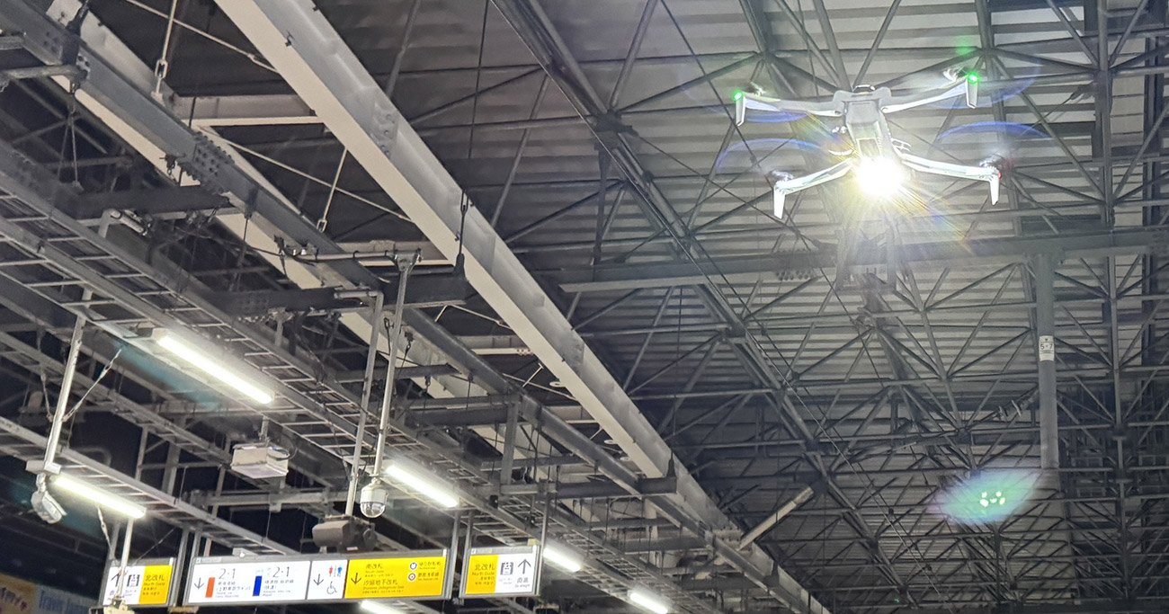 新橋駅構内でのドローン飛行試験の様子(JR東日本提供)
