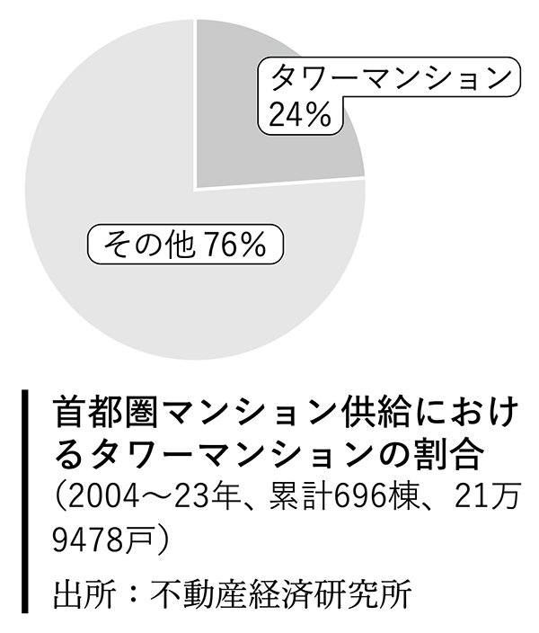 2004年から2023年までの20年間、首都圏でどのくらいの量のタワマンが供給されたかというと、実に696棟、21万9478戸です。この間の新築マンション供給戸数は91万9005戸なので、供給された新築マンションの23.9%、およそ4戸に1戸がタワマンという計算になります。