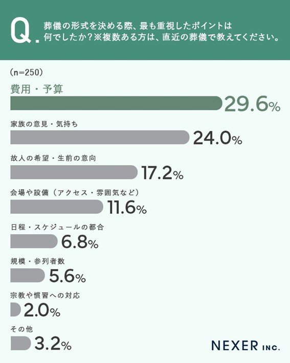 葬儀の形式を決める際、最も重視したポイントについては「費用・予算」が29.6%と最も高く、次いで「家族の意見・気持ち」が24.0%と続いています。