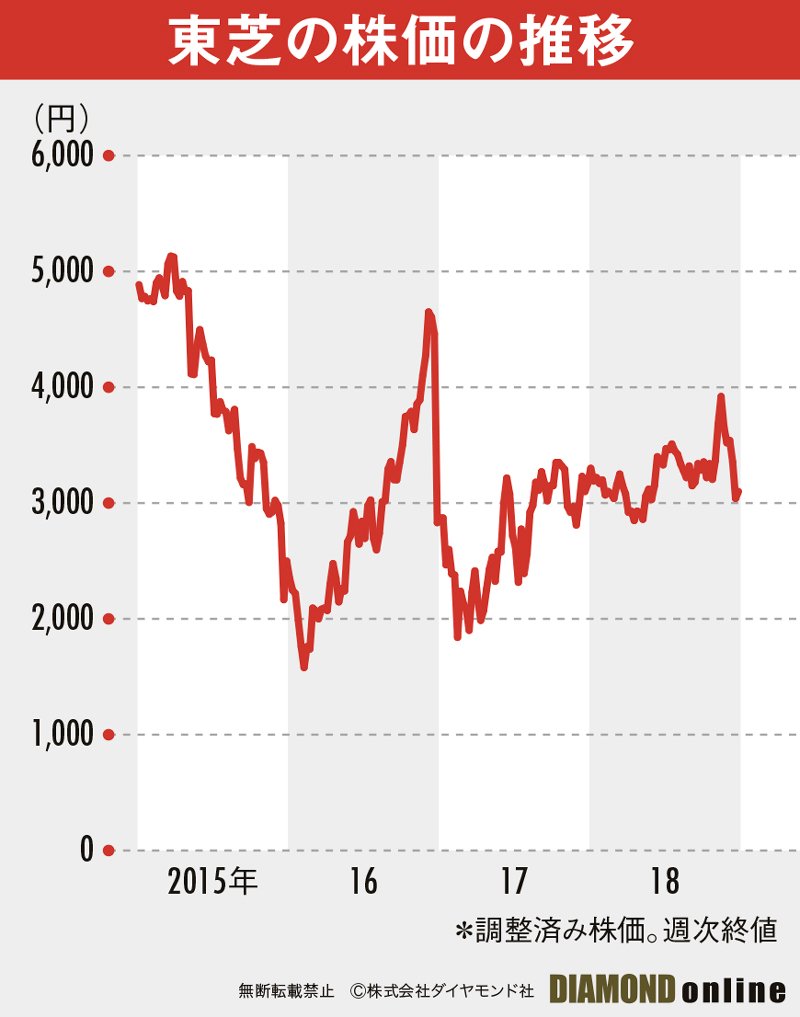 そんな「できちゃったハイイールド市場」の典型といえるのが、東芝の社債だった。名門企業・東芝の社債が売り込まれ始めたのは、15年に不正会計問題が発覚し、コーポレートガバナンスの悪化や信頼性低下を理由に格下げがされた時期である。業績への懸念から、株価も暴落した(下図参照)。