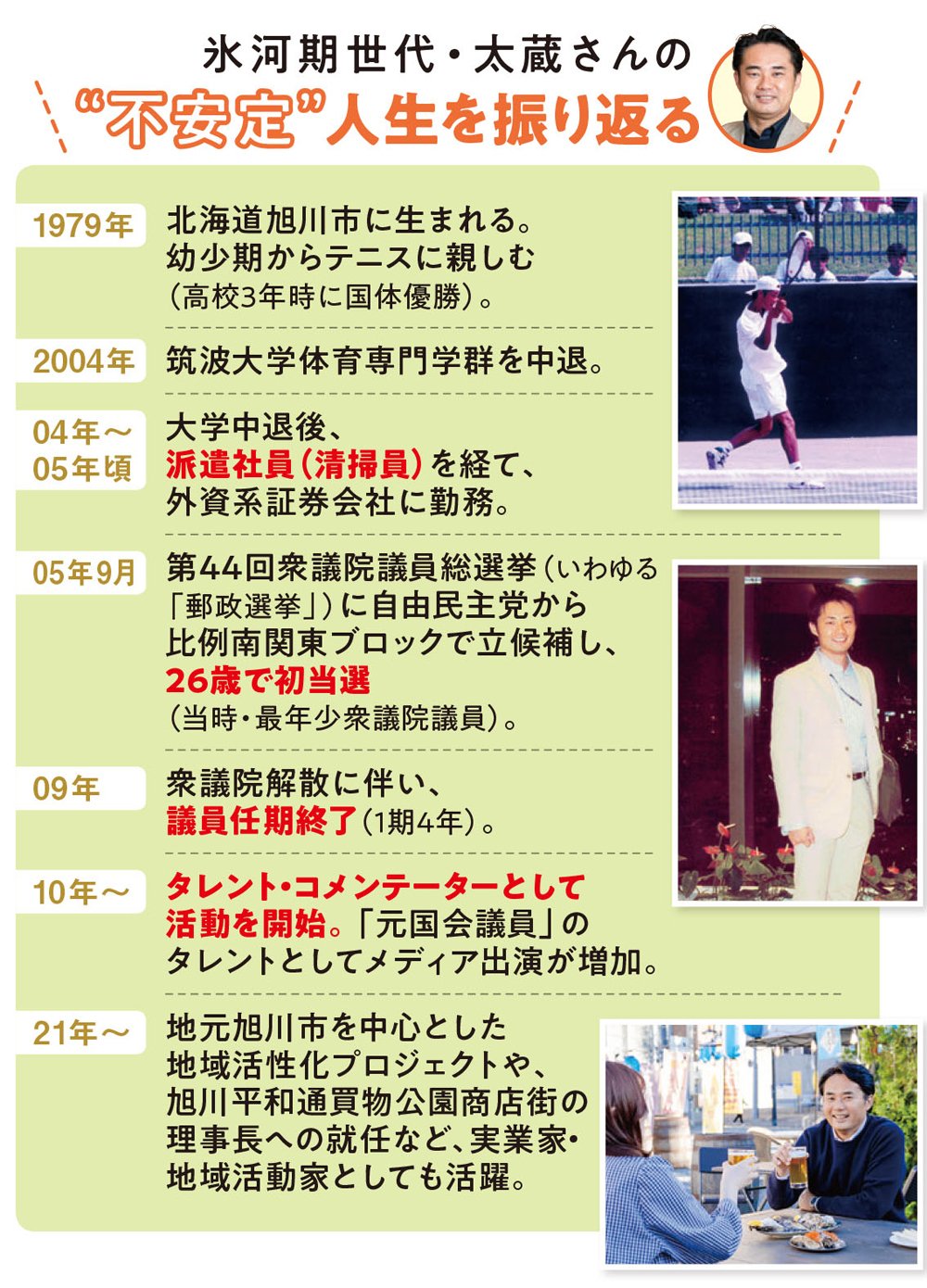 タレント・投資家・実業家 杉村太蔵さん●1979年8月13日、北海道旭川市出身。2004年3月筑波大学中退。派遣社員から外資系証券会社勤務を経て、2005年9月衆議院議員総選挙当選。現在は、テレビ・ラジオ・雑誌などメディアで活動する一方、派遣社員から国会議員、落選して無職からタレントに転身という自身の経験を交えながら、「政治・経済」をテーマに語る講演活動を全国で行う。