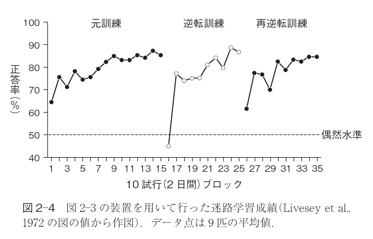回し車のあるほう(正答)は左か右かの2択なので、偶然の正答率は50%である。訓練を続けると90%近くまで成績が向上する(図2-4の左のデータ線)。回し車で走ることが報酬として機能しているといえるだろう。