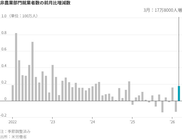 3月の非農業部門就業者数は前月比17万8000人増となり、2月の13万3000人減(当初の数値から下方修正)からプラスに転じた。失業率も4.3%と、2月から低下した。一方で、あまり芳しくない項目もあった。一般労働者の賃金上昇率は、5年前の新型コロナウイルス禍後の経済再開以来、前年同月比で最も低い水準となった。