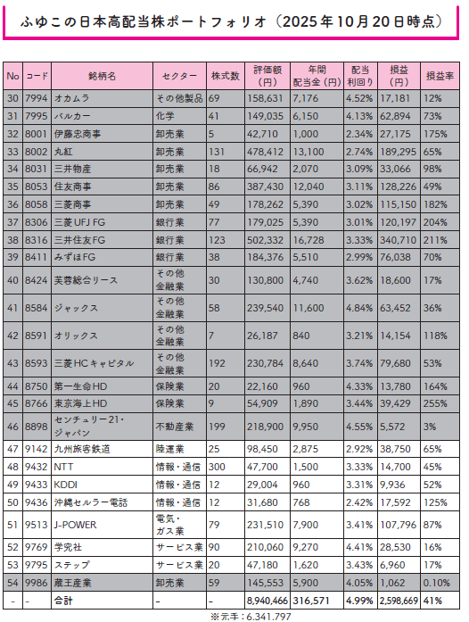 ここで、2025年11月にYouTubeチャンネル「節約オタクふゆこ」で公開した、わたしの日本高配当株ポートフォリオを全銘柄紹介します。