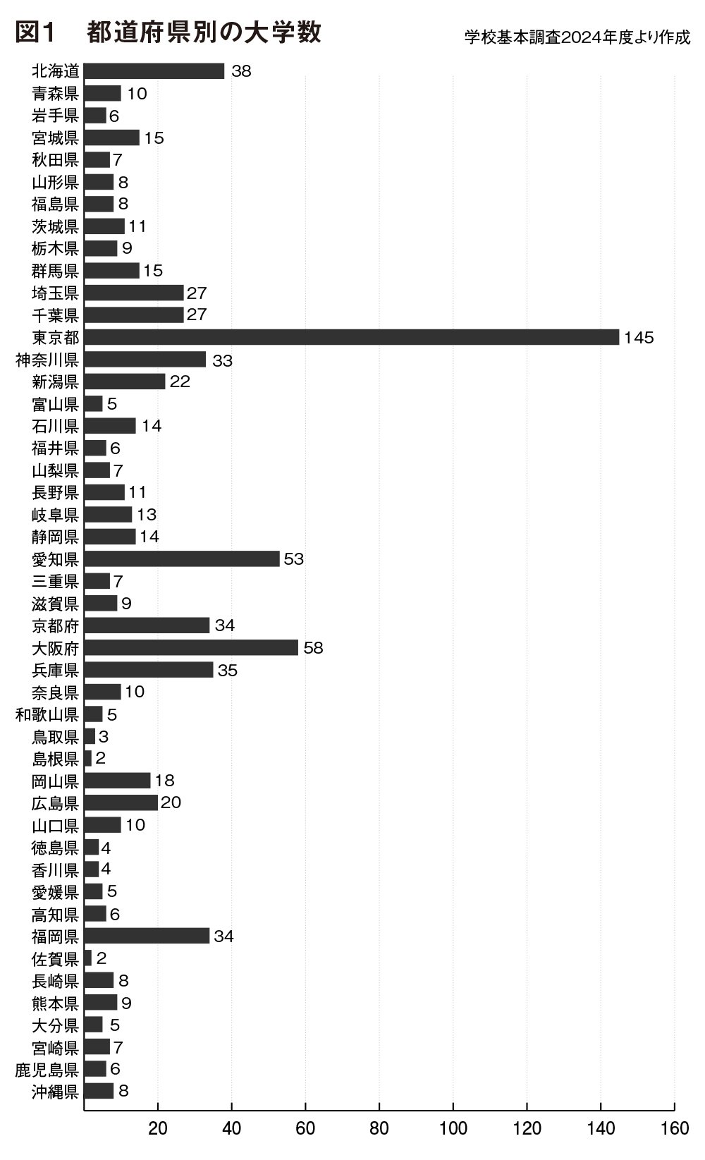 読者の皆さんが暮らす都道府県には、大学がいくつあるかご存じだろうか?図1からわかるように、日本の大学は、埼玉・千葉・東京・神奈川・愛知・京都・大阪・兵庫の三大都市圏に集中している(8都府県で全国の50.7%を占める)。大学数が多ければ、それだけ収容できる学生数も多くなる。