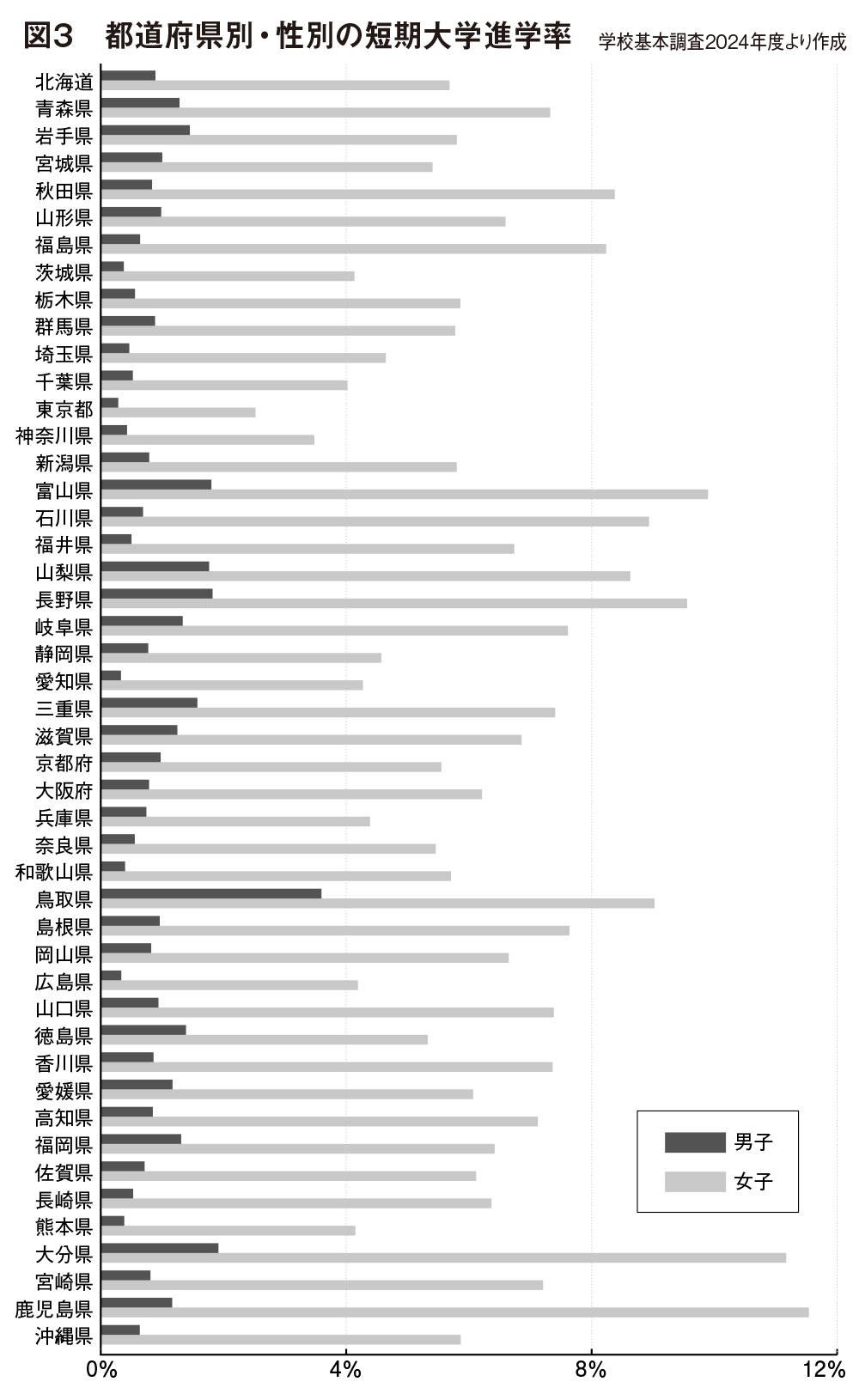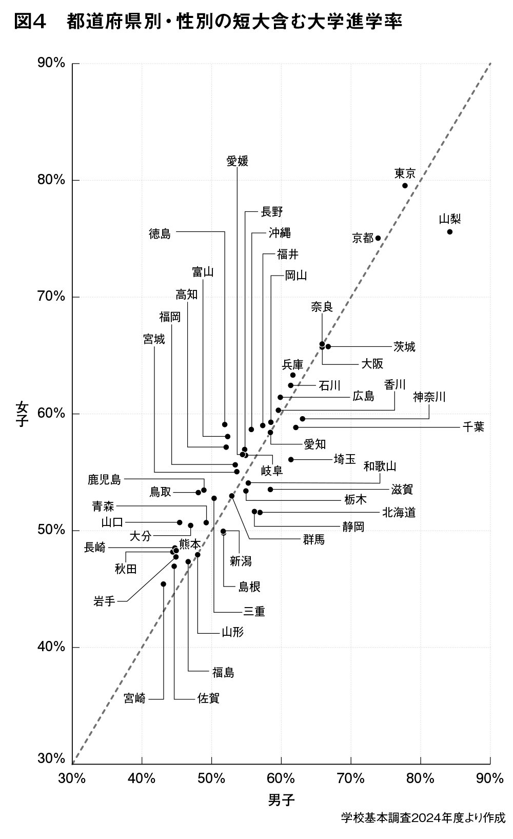 図3は、2024年度の短大進学率(*注1)を都道府県別・性別であらわしたものである。短大への進学は、圧倒的に女子で占められていることがわかる(*注2)。図4は、四年制大学と短期大学の進学率を合計したものである。