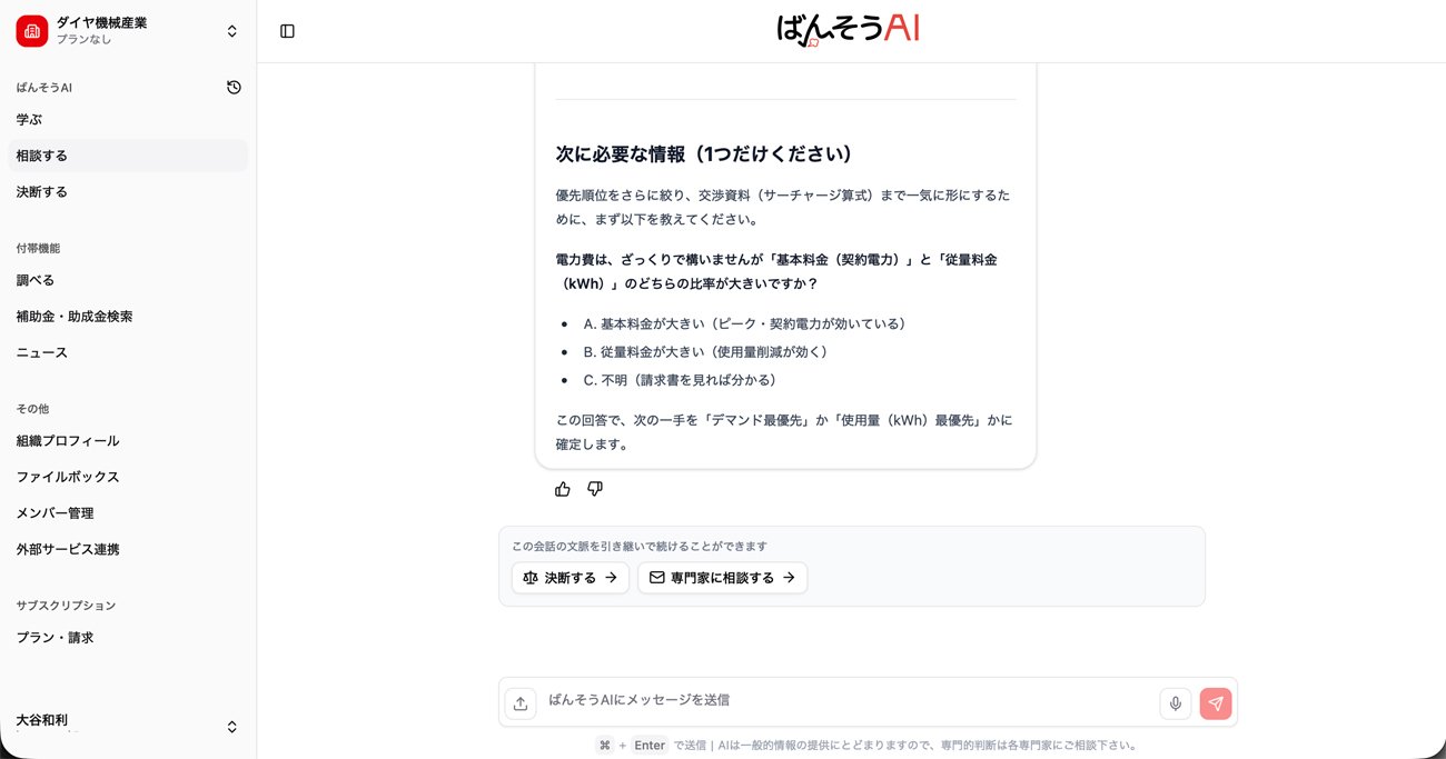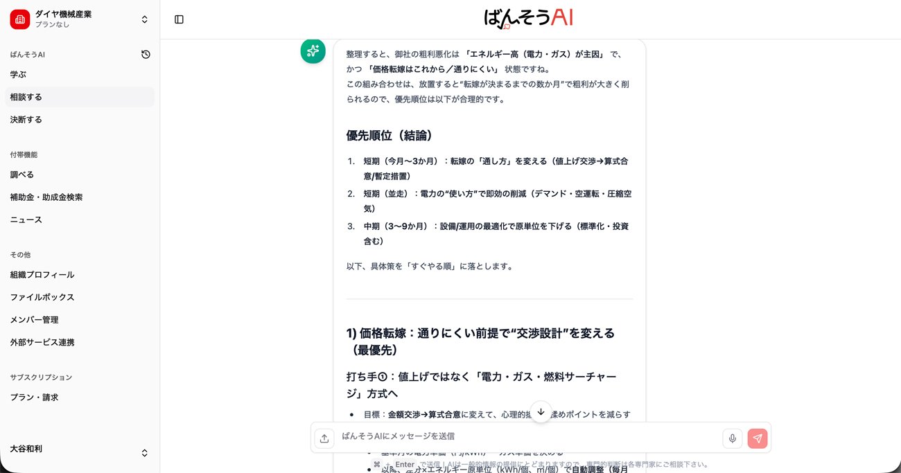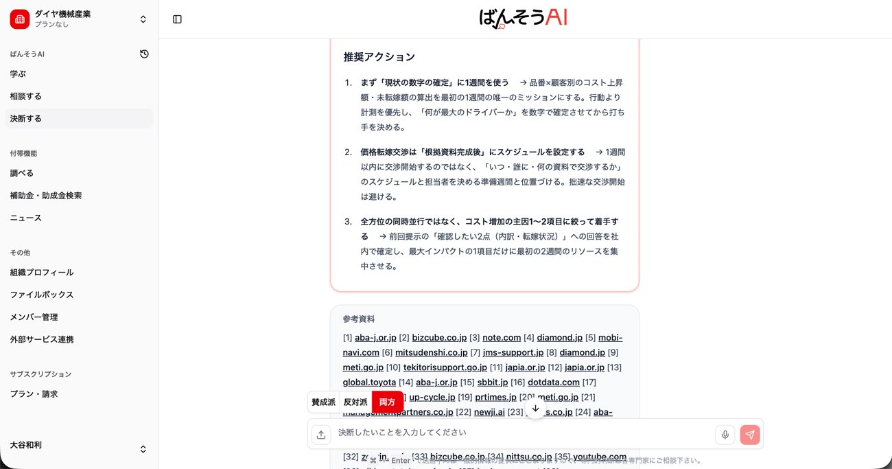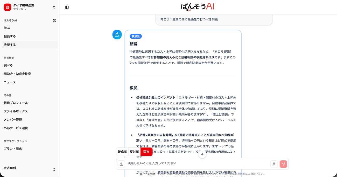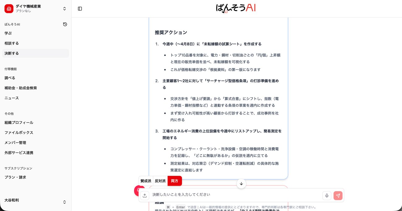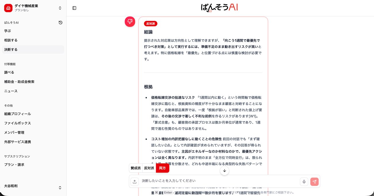 決断しようとする内容をAIに告げると、賛成と反対の両方の立場から冷静な分析が示される。その意味で「ばんそうAI」のAIは、ユーザーの右腕として現場を把握し、決断の後押しをしたり、逆にブレーキをかけたりする「番頭」のような存在といえる。さまざまな要素を考慮したうえで、最終的に経営者が自らの責任で決断できるよう導く――それがこのAIに与えられた役割だ。