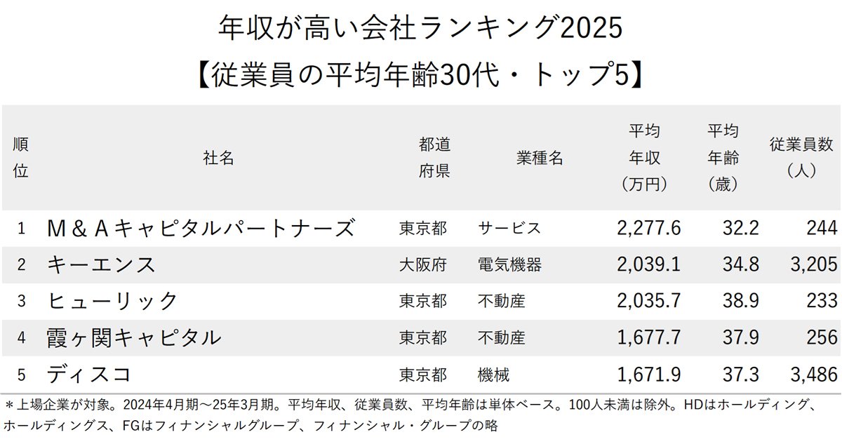 今回は、上場企業の有価証券報告書に記載された平均年収のデータを使って「年収が高い会社ランキング2025【従業員の平均年齢30代】」をお届けする。対象期間は2024年4月期~25年3月期。従業員数が100人未満の企業は除外した。