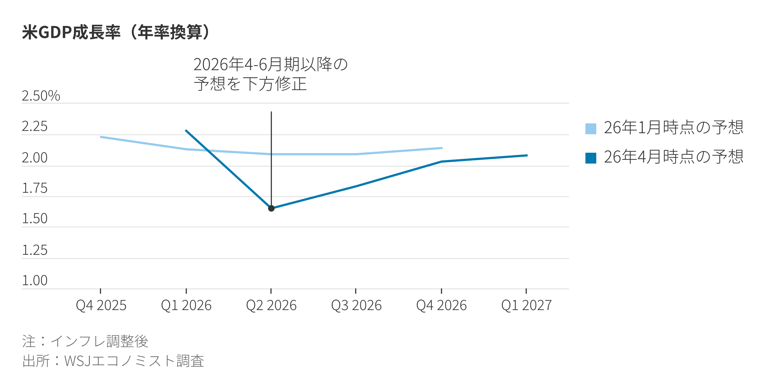 ここ数カ月の米経済は、成長鈍化・根強いインフレ・雇用市場の弱体化が顕著だ。エコノミストは、イラン戦争がこの三つの指標をさらに悪化させることを懸念している。先週、米国とイランは不安定ながらも停戦合意に至り、戦闘は一時停止したものの、戦争そのものの先行きは極めて不透明で、米国の労働者や消費者に与える影響の予測はなおさら困難だ。しかし、ウォール・ストリート・ジャーナル(WSJ)が定期的に実施しているエコノミスト調査によると、年初の予想と比べて、今後1年間の見通しは全般的に暗いものとなっている。ほとんどのエコノミストは、激しいインフレから貿易・移民政策の大転換に至るまで、最近の一連の逆風を乗り越えてきた底堅い経済がイラン戦争で失速するとは考えていない。調査に参加したエコノミストらは、今後12カ月間の景気後退(リセッション)確率を33%としており、1月時点の27%からわずかに上昇した。