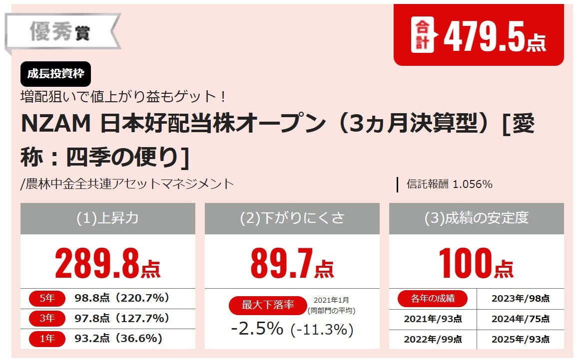 (3)の成績の安定度では、他の受賞投信よりも得点が若干低いが、各年で70点以上と高い水準をキープ。総合得点は450点を超え、優秀賞受賞となった。