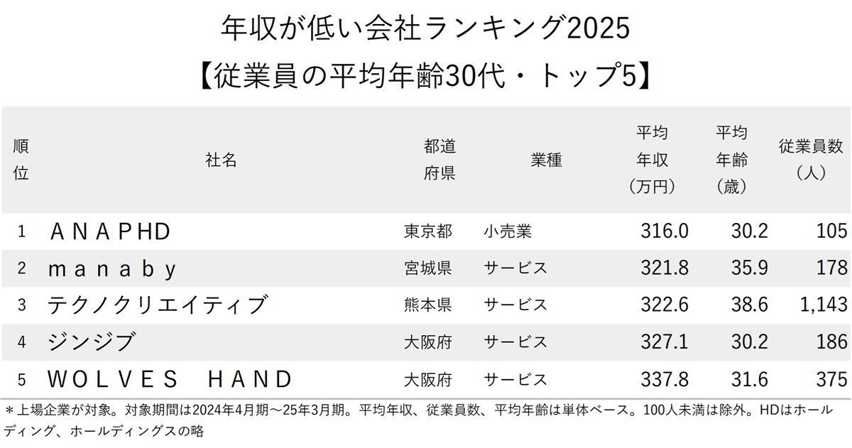 今回は、上場企業の有価証券報告書に記載された平均年収のデータを使って、「年収が低い会社ランキング2025【従業員の平均年齢30代】」を作成した。