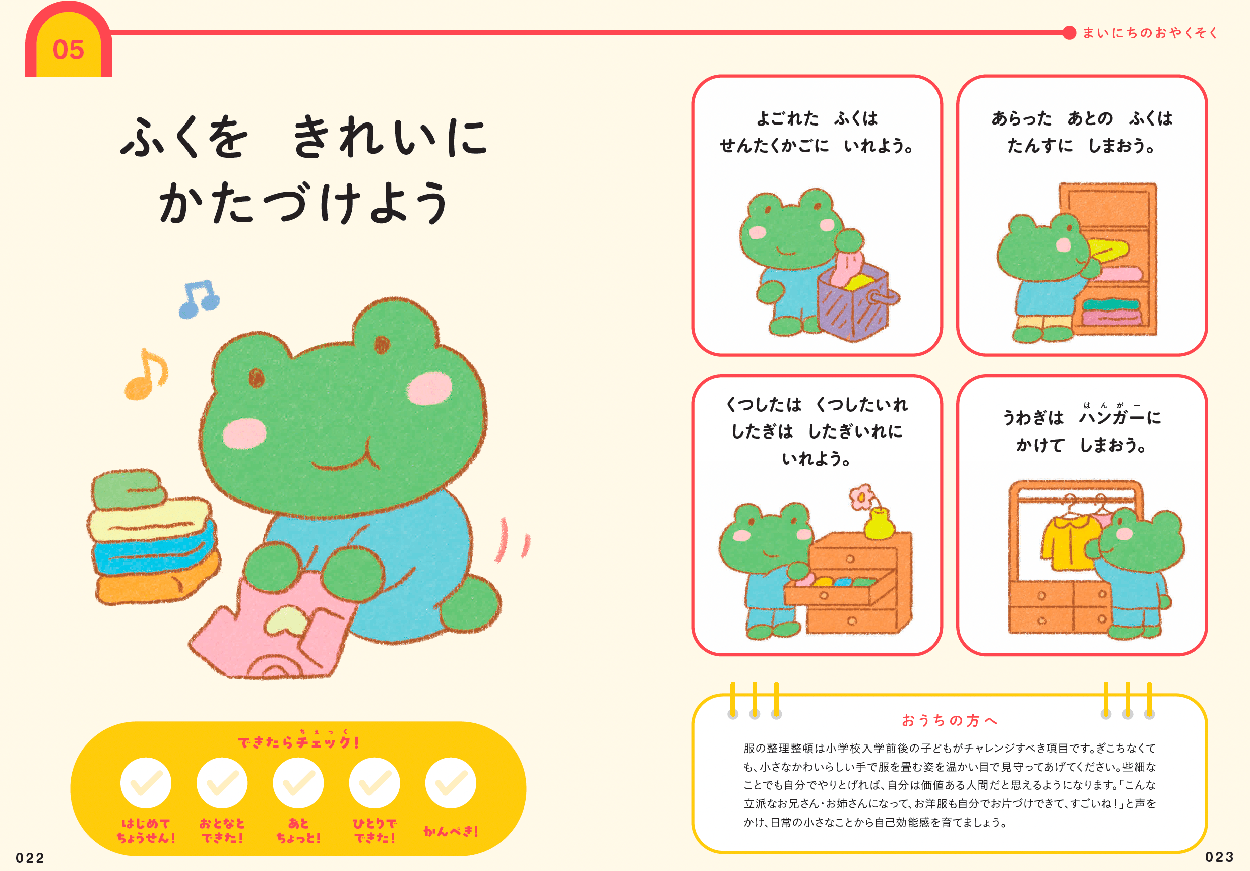 そのママさんが「片付けの習慣」を身につけさせるのに活用してくれたのが、小学校入学前後に身につけておきたい93のおやくそくをまとめた『まいにちがたのしくなるおやくそく できるかな?』という書籍だ。そのなかには、「ふくをきれいにかたづけよう」という項目がある。