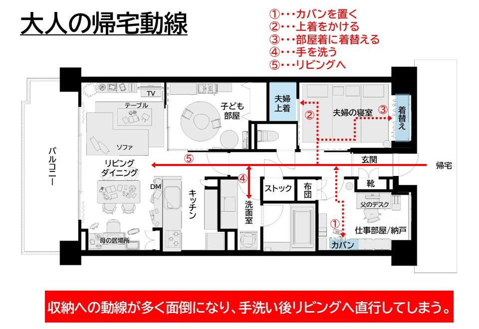 散らかる家の大人の帰宅動線(Before) 帰宅→(〈1〉〈2〉〈3〉を飛ばして)→洗面室で手洗い→リビングダイニングに直行 拡大画像表示