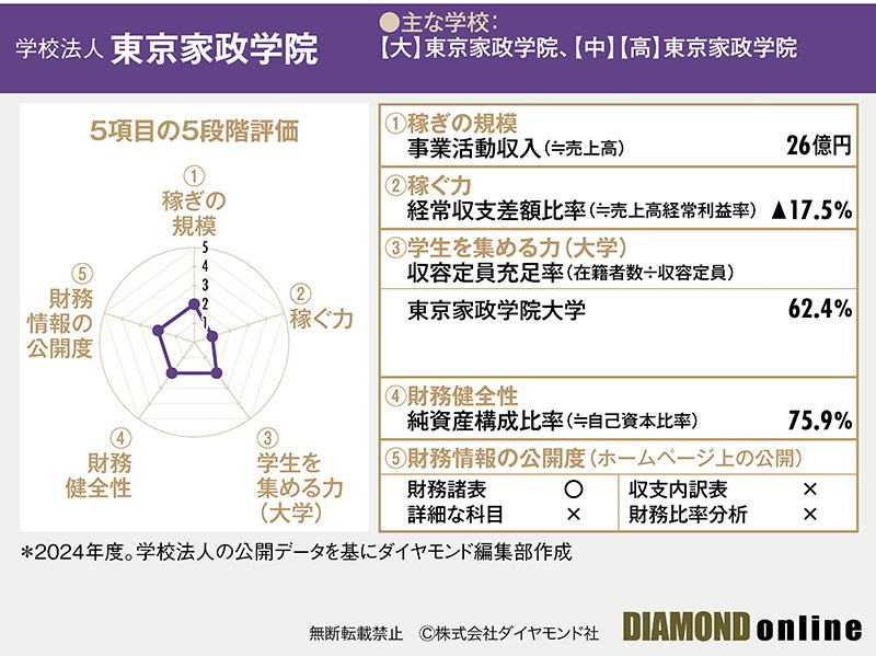 裏成績表は経営周りのデータ(24年度実績)を軸に、5項目を5段階で評価したもので、東京家政学院は評価項目の一つ、「(2)稼ぐ力」が5段階の最低評価である「1」となった。稼ぐ力の指標である「経常収支差額比率」は企業の売上高経常利益率に当たり、これが▲17.5%と大幅な赤字。とりわけ大学の定員が埋まらないことから、収入がコストを賄い切れない状態に陥っている。