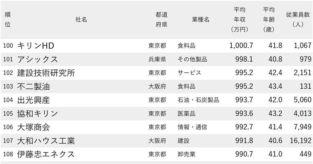 以下、ランキングを見ていこう。なお、本記事の対象は、単体の従業員数が100人以上の企業としている。また、持ち株会社(ホールディングス、本記事の表では「HD」と表記)は、少数の従業員で構成され、そのグループ企業の一般的な年収よりも高いケースが多いことをあらかじめお断りしておく。