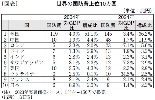 24年における世界の国防費のうち、米国は約36%を占める(図表)。トランプ大統領は、27年度の国防費は225兆円(対GDP比4.5%、GDPはIMF推計)とすべきと発言した。さらに、同盟国に対して、対GDP比5%以上の国防費の支出を求めている。