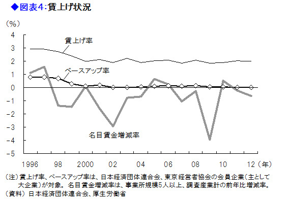 しかし一方で、派遣労働の対象や期間に対する制約の縮小を目指す労働者派遣法改正の動きを受けて、正社員減少、派遣社員増大という動きは止まらないと考えられる。その結果、これまでもそうだったように、派遣労働者を含めた一人当たり賃金の伸びが、主要企業正社員の賃金の伸びを大きく下回る状態が今年も続く可能性が高い【図表4:賃上げ状況】。