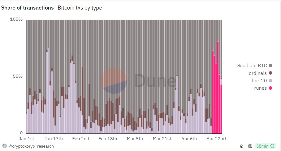 また、Dune Analyticsによると、4月20日のローンチ日におけるRunesの取引は、ビットコイン取引全体の72.7%を占め、その後も50%以上を占めていることがわかる。
