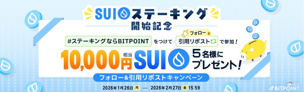 | BITPOINT | ①新規口座開設完了後に1,000円以上の仮想通貨購入で2,000円相当のビットコインをプレゼント【2025年12月17日(水)16:00 ~ 2026年2月2日(月)15:59】 ②キャンペーン期間中にSUIを1万円以上購入した方の中から抽選で5名に10万円相当のSUIをプレゼント【2026年1月26日(月)10:00 ~ 2026年2月27日(金)15:59】 ③公式Xフォロー&指定の引用リポストで抽選で5名に10,000円相当のSUIプレゼント【2026年1月26日(月)10:00 ~ 2026年2月27日(金)15:59】 |