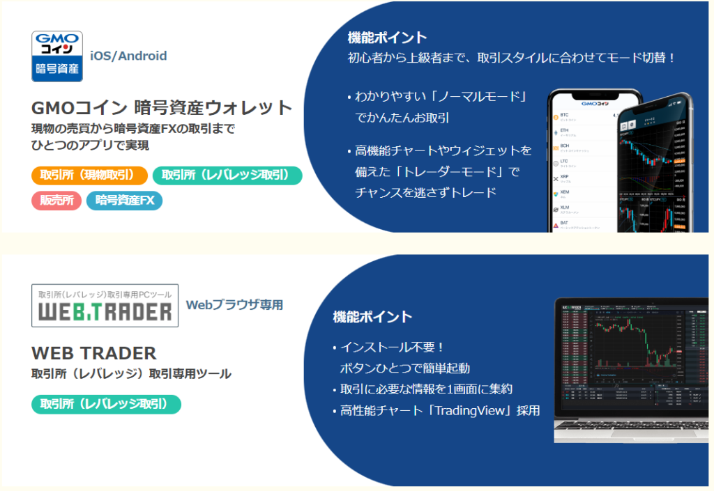 さらに2019年にリリースされたPCブラウザの取引ツール「WEB TRADER」は、レバレッジ取引(取引所)に特化された高機能ツールであり、テクニカル分析に長けた高性能チャートTradingViewにも対応している。