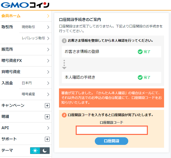 審査完了後、本人確認を「かんたん本人確認」でおこなった場合はメールで、「画像アップロード」でおこなった場合は郵送で、口座開設コードが届けられる。