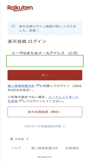 次に事前に登録した楽天会員IDとパスワードを入力し、「ログイン」をタップする。