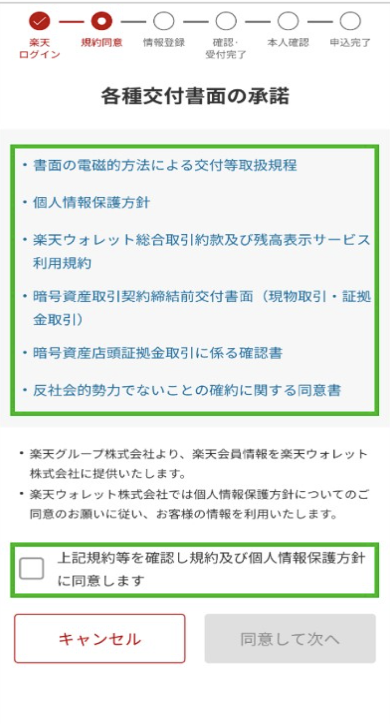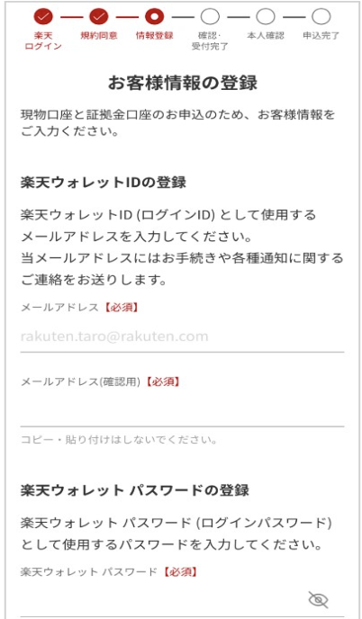 楽天ウォレットID、パスワード、氏名、生年月日などの必要事項を入力する。