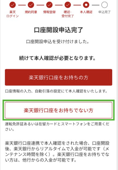 続いて、本人確認を行う。楽天銀行利用者の場合は、本人確認書類の提出は不要だ。ここでは、楽天銀行口座を持っていない場合の本人確認方法を解説する。