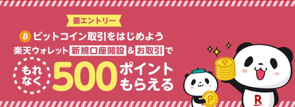 | 達成条件 | ①専用ページでエントリー ②楽天ウォレットの新規現物口座を開設 ③仮想通貨の現物取引をする(ポイント交換による仮想通貨取得も可) |