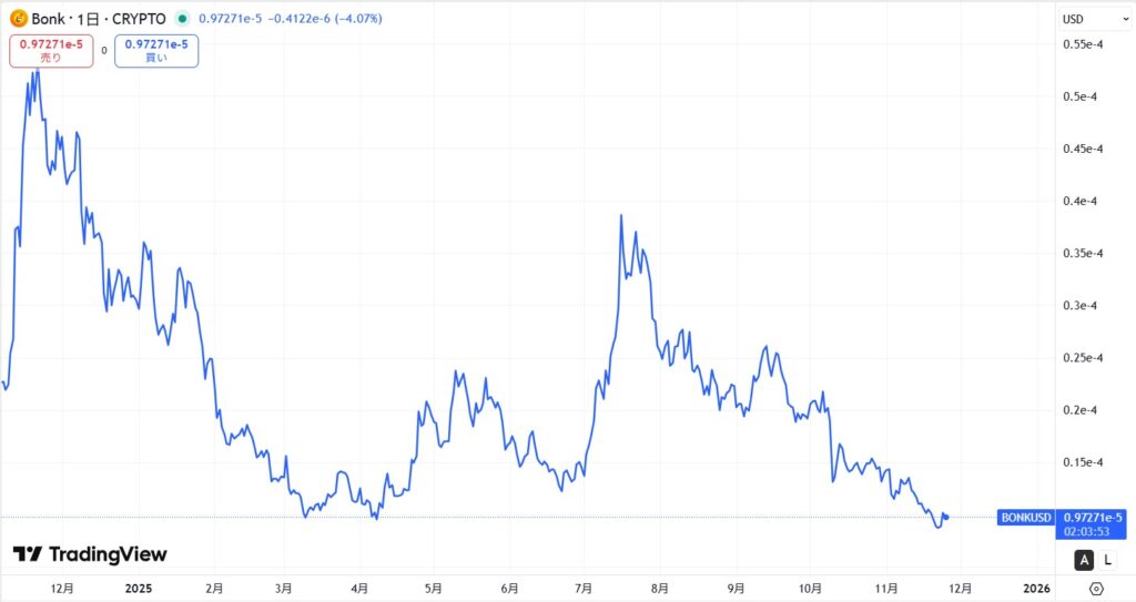 仮想通貨BONKの価格は、2024年12月に高値を付けて以降下落を続け、2025年11月26日現在、約0.000009727ドル前後で推移している。2024年1月上旬に0.0000097ドル付近まで下落した後は、上昇傾向が強まり、2024年1月10日頃からは上値を試す展開となっていた。